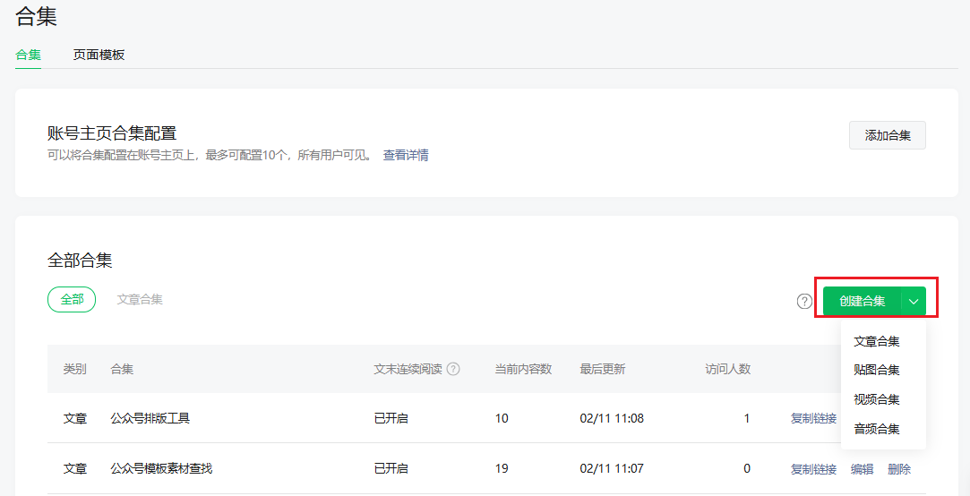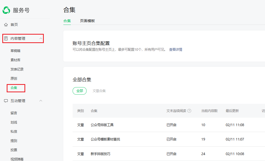 1、进入公众号后台,点击左侧 内容管理 → 合集,打开合集管理页面。