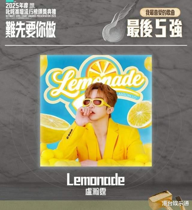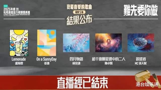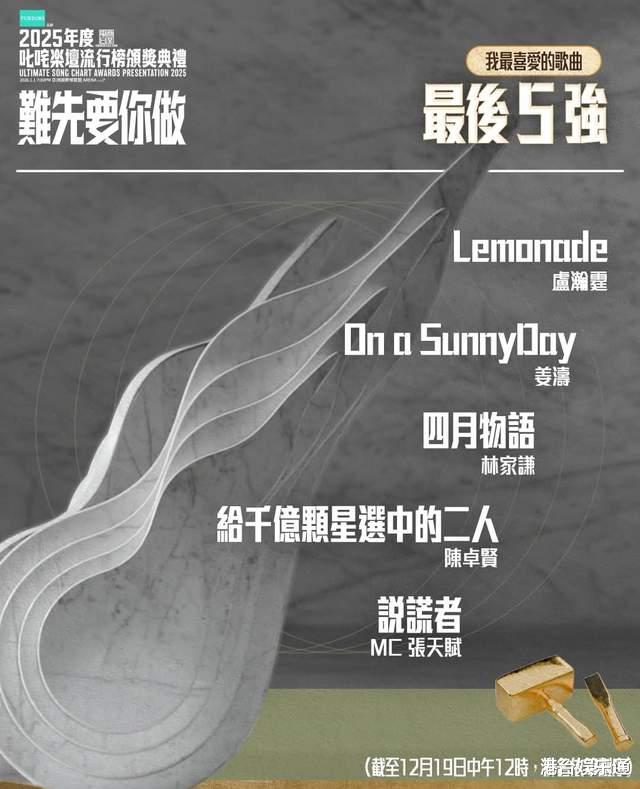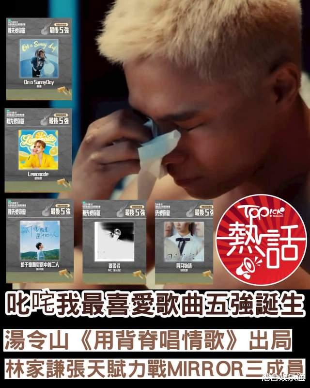 在名单中,来自MIRROR成员的有三首,分别为姜涛的《On SunnyDay》、卢瀚霆的《Lemonade》、陈卓贤的《给千亿颗星选中的二人》,延续了过去几年的统治力;另外两首则是张天赋的《说谎者》以及林家谦的《四月物语》。下图为商台社交账号发布的5强名单图:
