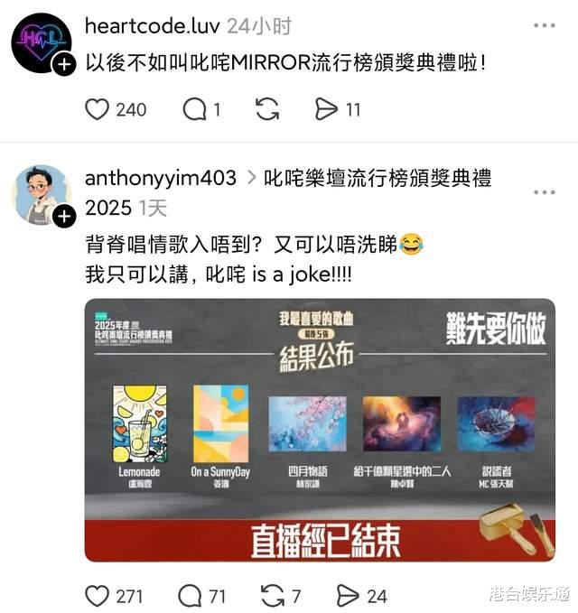 一位网友留言称:“以后不如叫《叱咤MIRROR流行榜颁奖典礼》啦!”另一位网友表示:“《用背脊唱情歌》进不了(5强)?又可以不看了,我只可以说,《叱咤》is a joke!!!”还有网友则说:“今年最红的就是《用背脊唱情歌》和《说谎者》了,又是XX镜(指MIRROR)的XX歌拉低乐坛质量。”