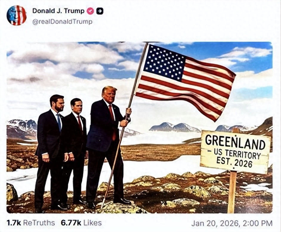 特朗普凌晨在社交平台发了张图,手里举着美国国旗,说自己“登上”了格陵兰岛,还标注这岛2026年要成美国的。