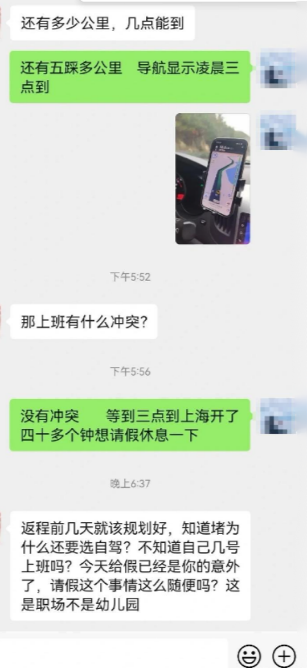 领导质疑其凌晨三点到,和上班有什么冲突?该网友回复:“没有冲突,开了四十多个钟想请假休息一下。”