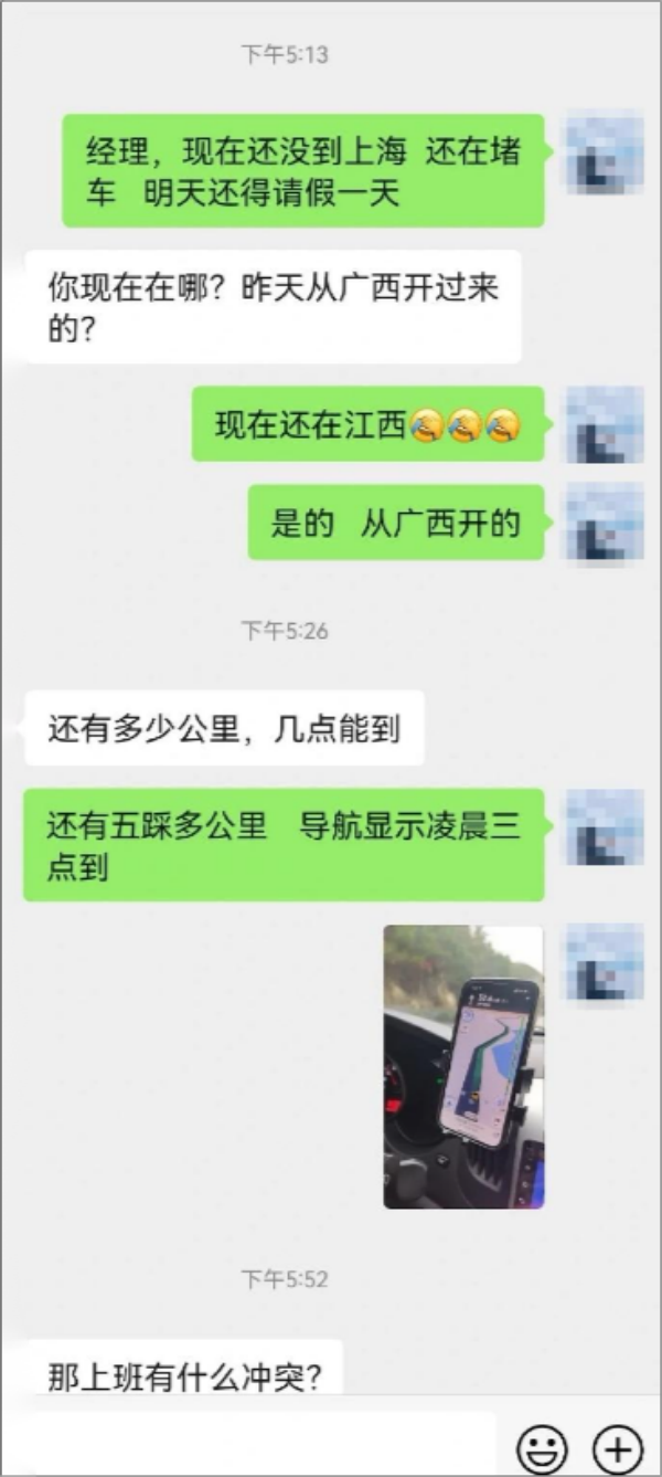 该网友从广西出发到上海,虽然已经提前一天出发,但因为堵车,和领导申请再请假一天。