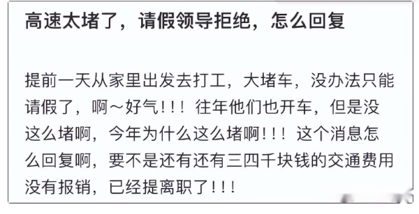 有网友发帖:“因为高速太堵跟领导请假被拒了,要怎么回复?”还附上了2张聊天截图。