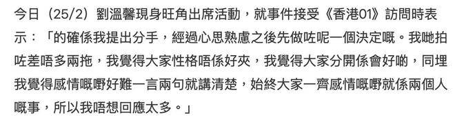 事实上,刘温馨在最初不打算回应分手一事。当她在社交平台上发布疑似分手的消息后,媒体就开始联系她询问详情。她当时回应称不方便回应,显然这已经是默认的分手信号。但随着时间的推移,刘温馨还是选择了面对公众,承认了这一事实。她的回应算得上得体,不多说细节,不随便评论别人,只简单明确地说出原因——性格不合,分手就是分手。她看起来心态平和,显然不打算再为过去的感情做过多辩解,未来也不会再对这段感情做过多回应。