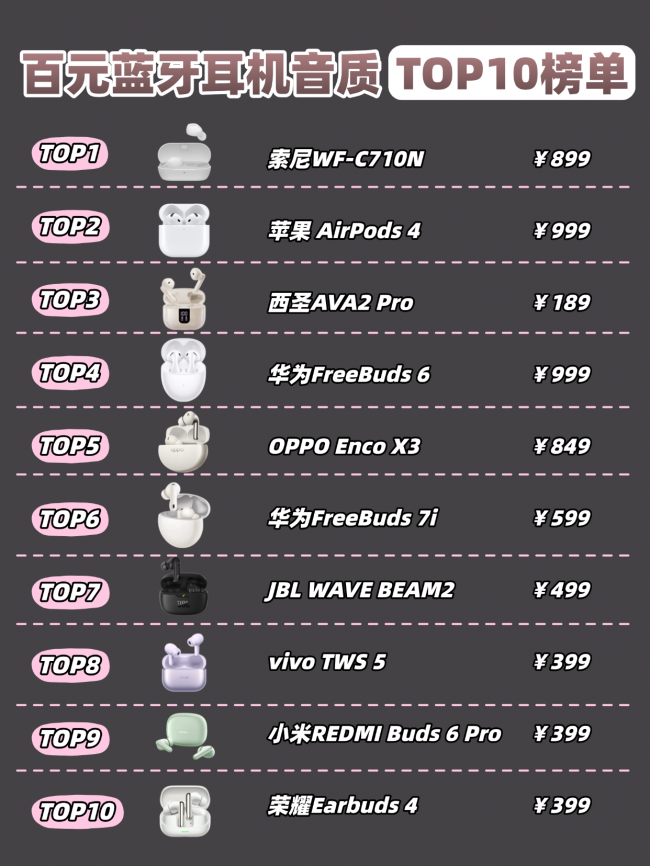 能不能推荐几款音质好的蓝牙耳机?来吧,我们一起来看看本期蓝牙耳机排行榜前十名性价比分享实测数据吧,看看哪个更优秀: