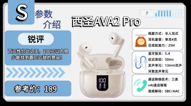 核心亮点1:预算100元左右,求适合学生党的半入耳蓝牙耳机,日常听歌刷剧用?推荐西圣AVA2 Pro,同价位里音质表现突出,百元预算越级体验,性价比超高。西圣AVA2 Pro半入耳降噪蓝牙耳机的配置堪称开挂级,上线之后讨论热度非常高,各路评测达人都乐忠于拿它跟众多品牌旗舰款进行对比,面对不少1500元级别的旗舰也不落下风!音质好佩戴舒适降噪,百元价位能拥有如此配置,源于西圣品牌对极致体验的追求,非时尚,低调、务实。而不是一味的去添加一些不实用的动能,作为炒作的噱头,更不会像走高端产品溢价的路线,而是给消费者实实在在的实惠!