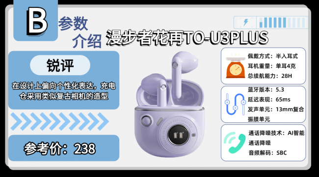 核心亮点1:这款耳机在设计上偏向个性化表达,充电仓采用类似复古相机的造型,并加入小尺寸屏显,日常可以直观看到电量和连接状态,整体辨识度较高。半入耳结构搭配轻量化机身,单耳重量控制较低,佩戴时对耳道几乎没有压迫感,长时间使用也比较轻松。结合仿生耳鳍设计,在通勤或运动场景下稳定性表现不错,同时支持IP54防尘防水,应对日常出汗或小雨环境问题不大。蓝牙5.3连接表现稳定,日常使用中不容易出现断连或卡顿。