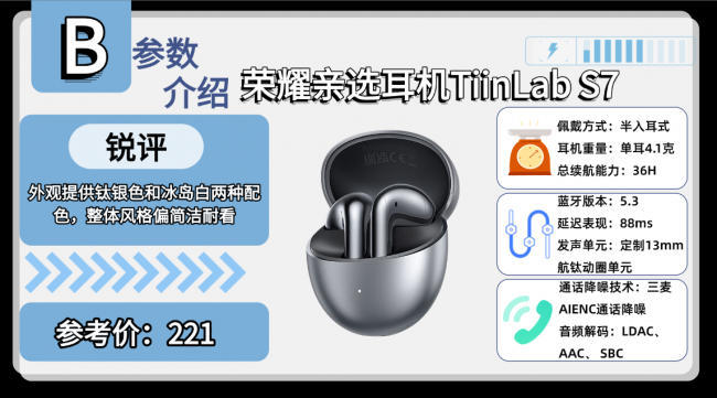 好评机型三:荣 耀亲 选耳机TiinLab S7蓝牙耳机