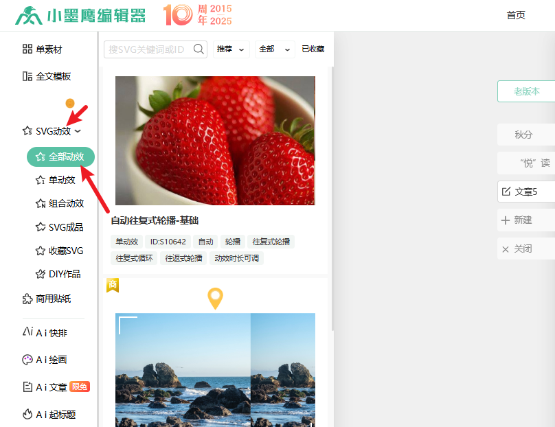 1、打开小墨鹰编辑器,在左侧找到「SVG 动效」,进入「全部动效」页面。