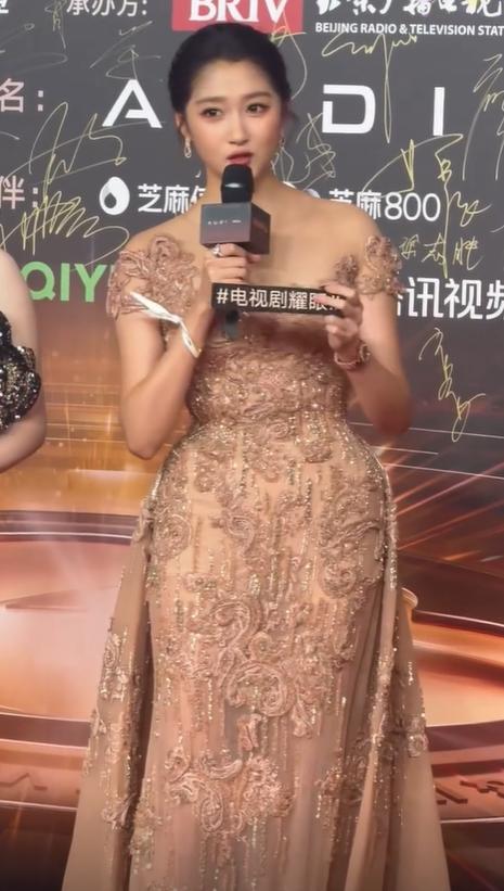 关晓彤身穿一些裸色花卉长裙,这件礼服是高定,只不过穿在关晓彤的身上把她衬托的很老气。众所周知,关晓彤身材最具看点的就是那双逆天大长腿。 但这条长裙把腿盖得严丝合缝,亮片又把上半身裹成反光板,头小肩宽的缺点被灯光放大,导致视觉上有些“胖”。