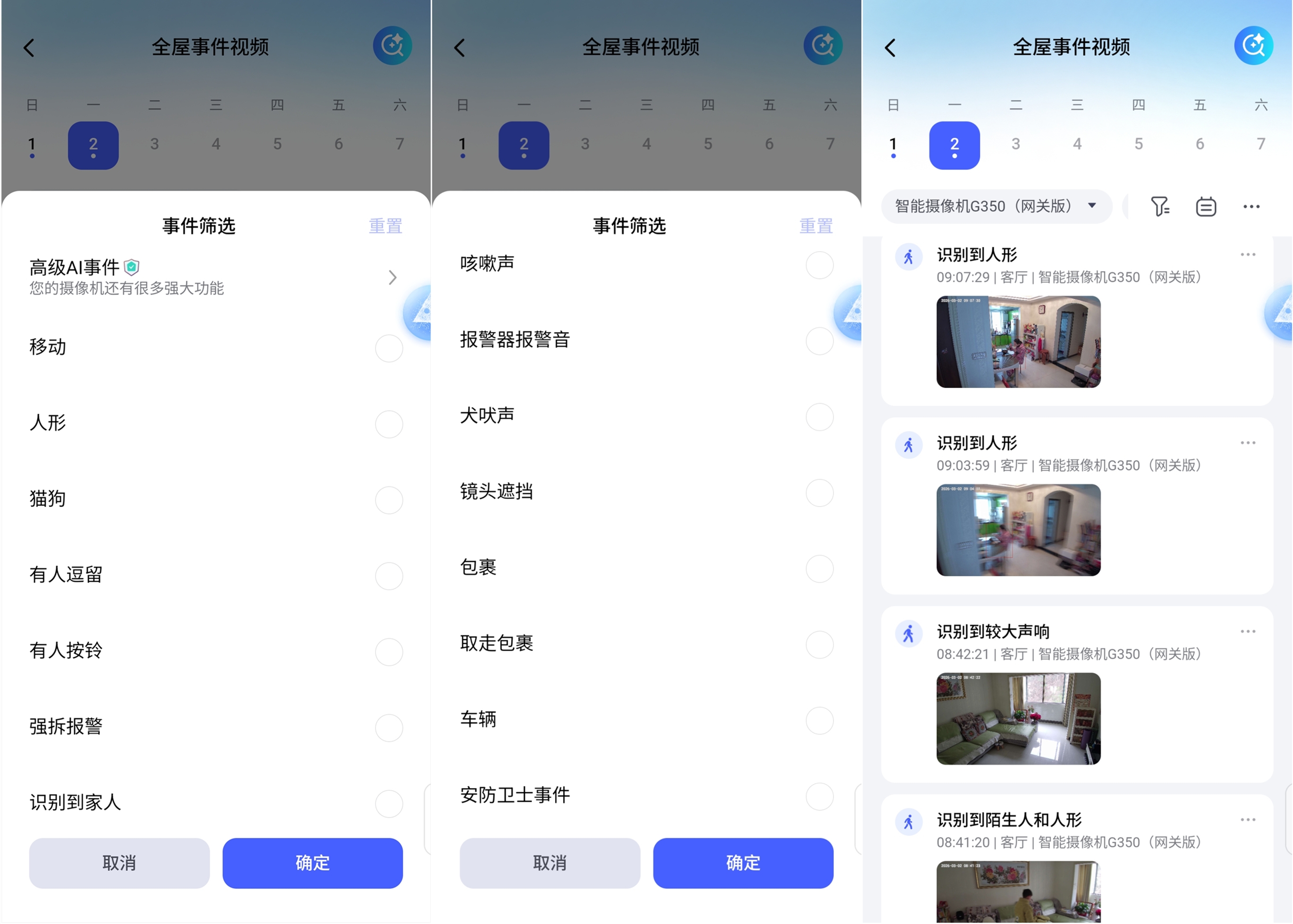 除此之外,它还能识别宠物、哭声、咳嗽声、玻璃破碎声,甚至是家里的异常声响——有一次孩子不小心打翻了水杯,发出的声响被它捕捉到,我第一时间收到通知,远程喊孩子赶紧清理,避免了水洒到插座上的危险。