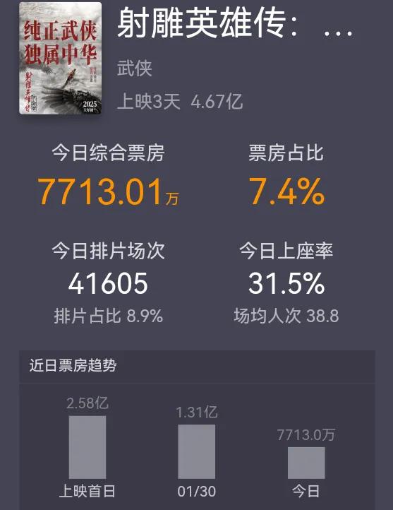 场均人次从63.9人降到了38.8人。上座率从53%降到了31.5%。各项数据的下降带来的最直接影响就是票房大幅度降低。上映首日拿到了2.58亿,结果一天之后1.3亿,降幅50%。今天不知能不能破亿,按照这个趋势此后想每日破亿是没希望了。