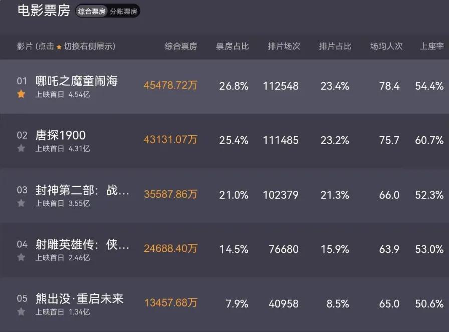 在口碑方面,评分最高的自然是哪吒二,还涨了0.1分,封神二又跌了0.2分,唐探跌了0.1分。目前前5名也就只有【射雕】没有开分,估计是还不好意思开吧!不知道能不能达到及格线?