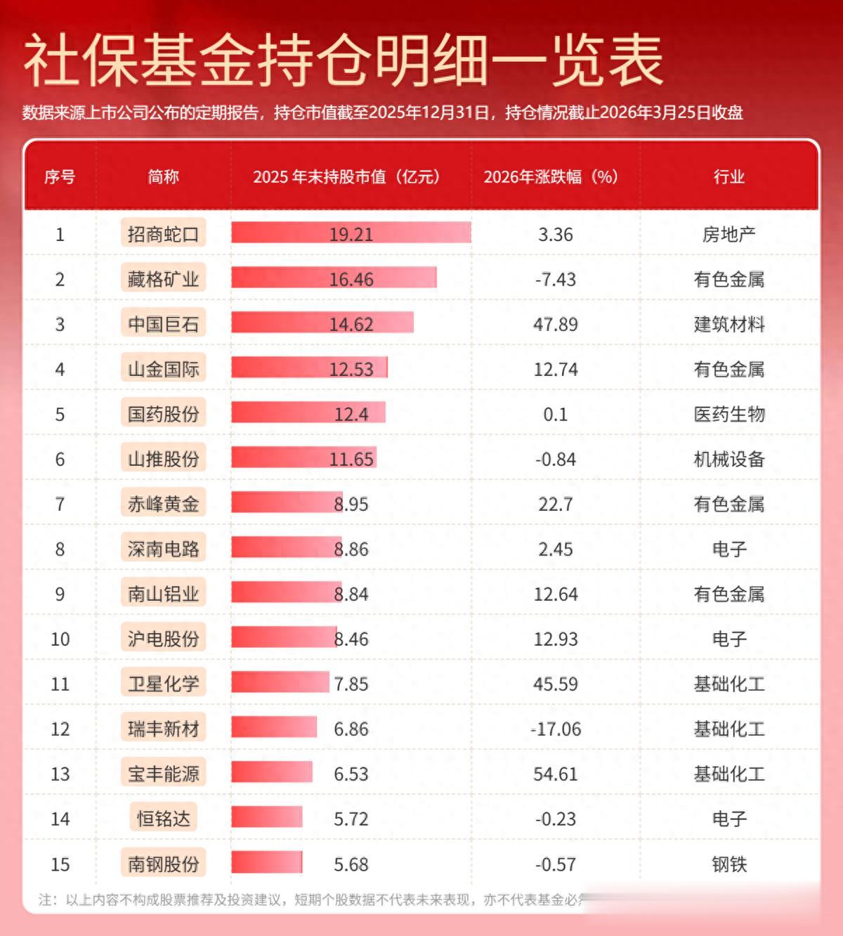 全国社会保障基金是国家社会保障储备基金,由社保基金会管理运营,用于人口老龄化高峰时期的养老保险等支出。在已披露的2025年报数据显示,社保基金持股市值居前的重仓股包括招商蛇口、藏格矿业、中国巨石、山金国际、国药股份等公司。