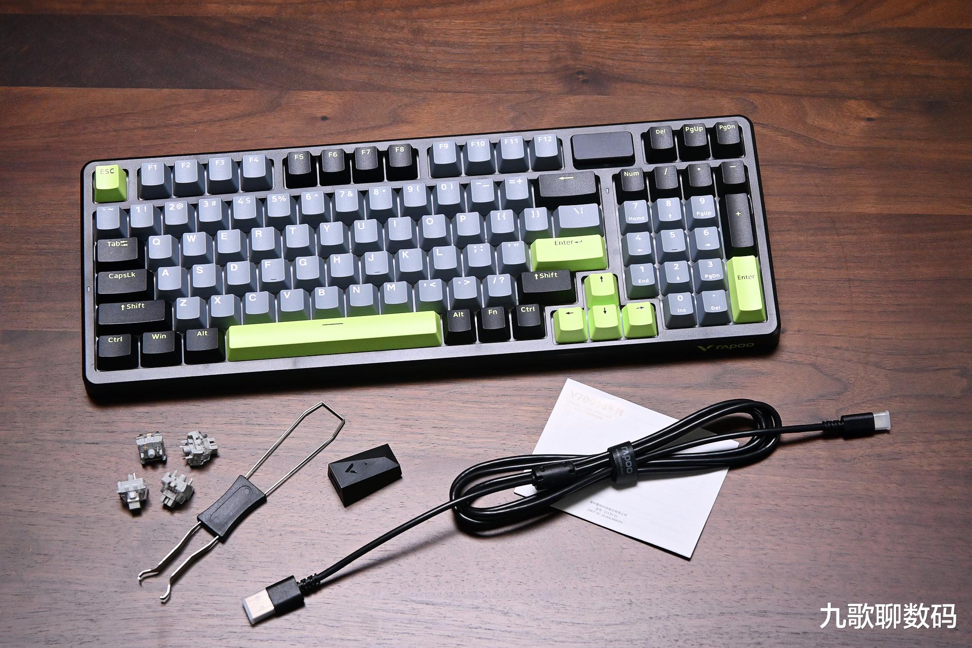 内容物都给的很齐全,先来看下V700长续航版键盘吧,包含键盘本体、说明书、拔键器、2.4G接收器、四颗备用轴体(为与原轴体相同的凯华定制轴,便于后期损坏更换)和Type-C口数据线(线缆上带有抗干扰的磁环)。