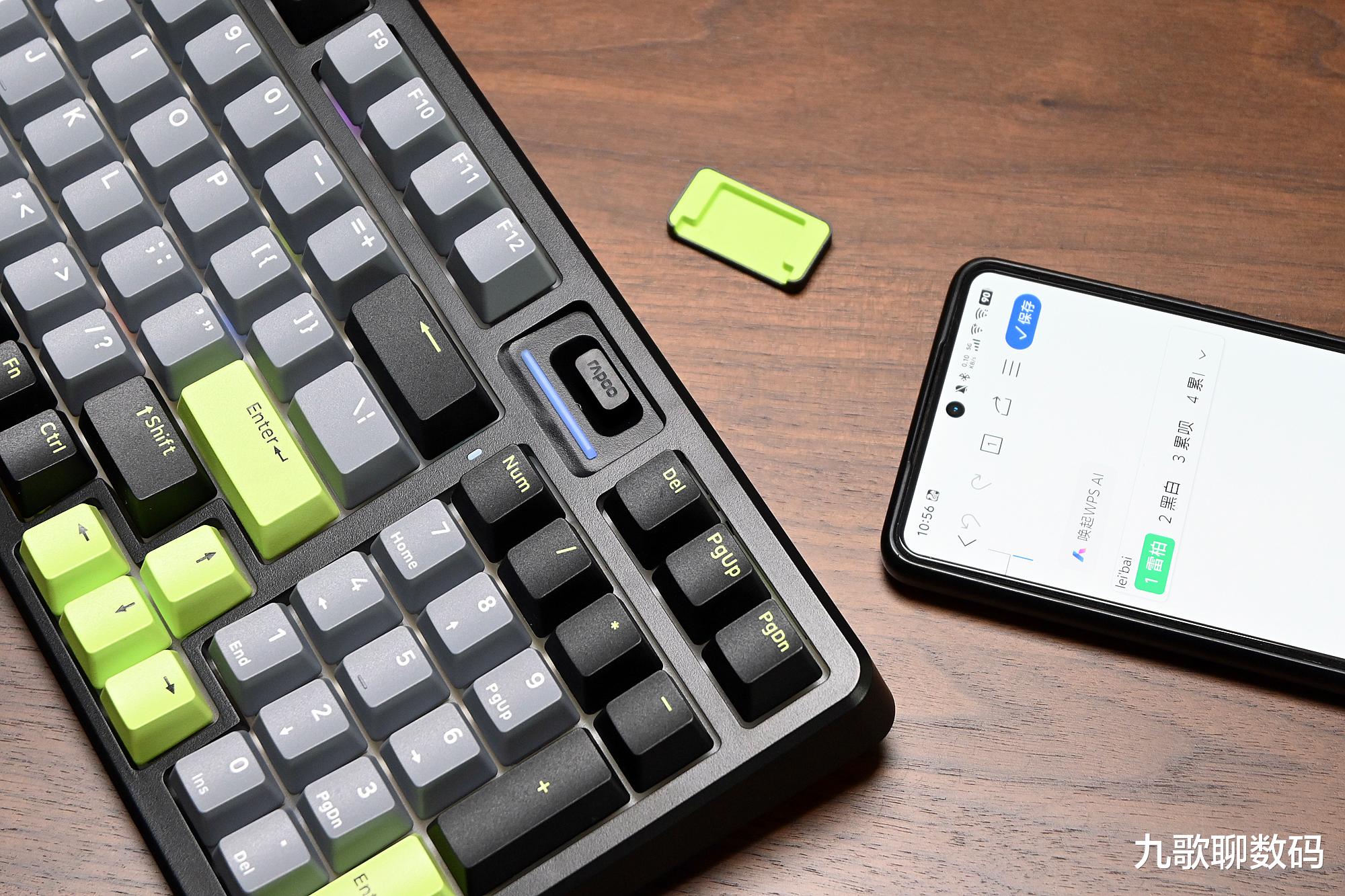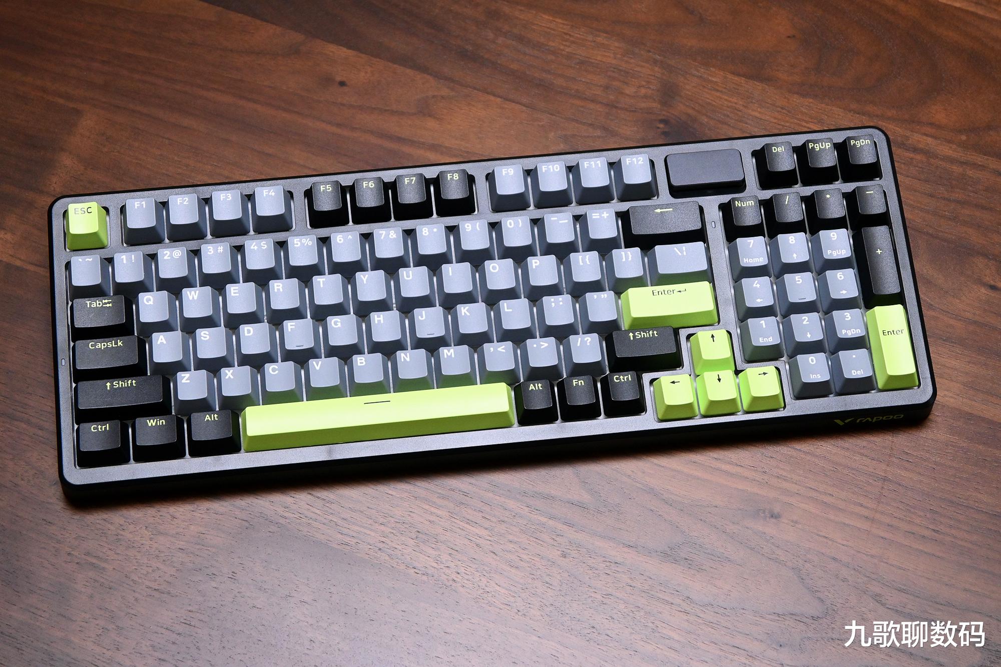 V700系列在配列上有75和98键之分,配色上则有莫奈仙踪、初号骑士、幻影机甲三种可选。我入手的是中间那款。键帽布局黑、灰为主,间杂以青春绿作为点缀,还是很耐看的。键盘的具体“三围”为388*143*42mm,相较于常规全尺寸键盘要更为紧凑(不过保留了完整的数字小键盘和主要功能键),也更加便携,可以轻松塞背随身背包里。F1-F12为多媒体快捷键,搭配Fn组合可完成如搜索、播放控制等操作。键盘全键无冲,其96个键均可编程。