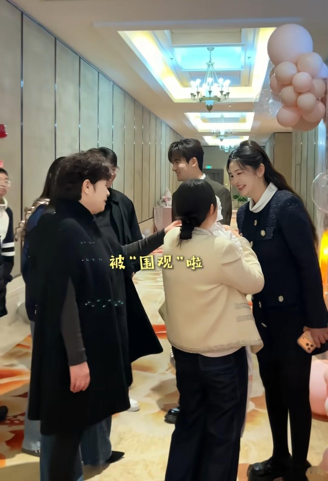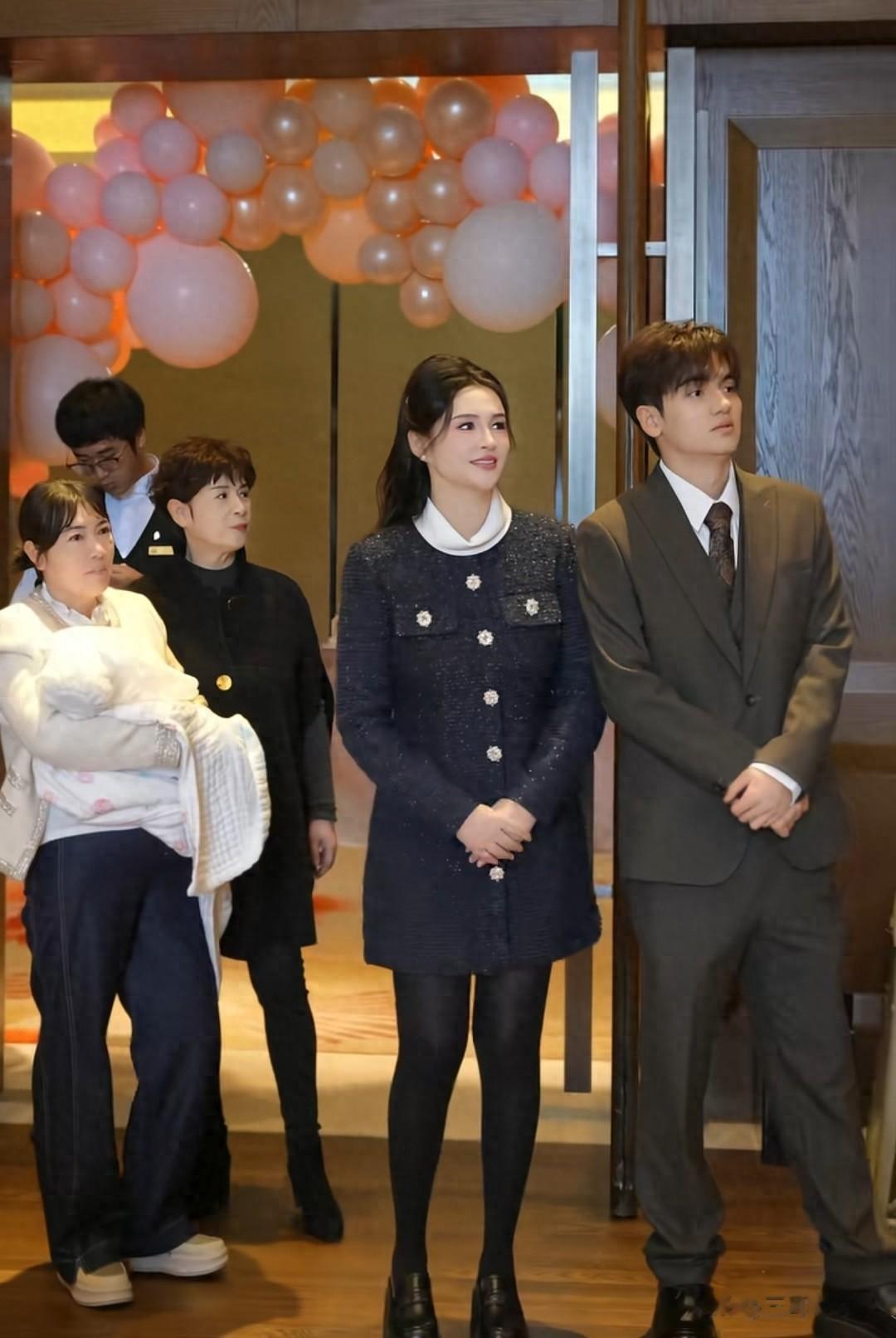 小9岁老公刘子瑞穿着一身西装,非常帅气。旁边短发是李心艾妈妈,母女俩长的非常相像,女儿被保姆抱在怀里。