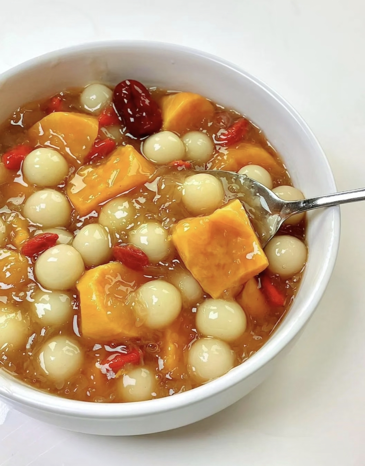 盛出一碗,橙黄的红薯、雪白的银耳、剔透的圆子和艳红的枸杞交相辉映,色彩明快,赏心悦目。用勺子舀起一勺送入口中,首先是小圆子的软糯Q弹,接着是红薯的绵密香甜,最后是银耳羹的顺滑胶润,各种口感在舌尖层层递进,和谐交融。温热的汤汁顺着喉咙滑下,暖意瞬间传遍全身,仿佛连春日的微寒也被驱散殆尽。这不仅仅是一碗甜汤,更是一份亲手创造的温暖与甜蜜,是对忙碌生活最温柔的犒赏。