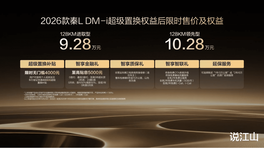 10月23号,2026款的秦L DM-i正式开卖了。这次就推了两个配置,名字很直白:128KM 进取型:指导价9.68万;128KM 领先型:指导价10.68万。