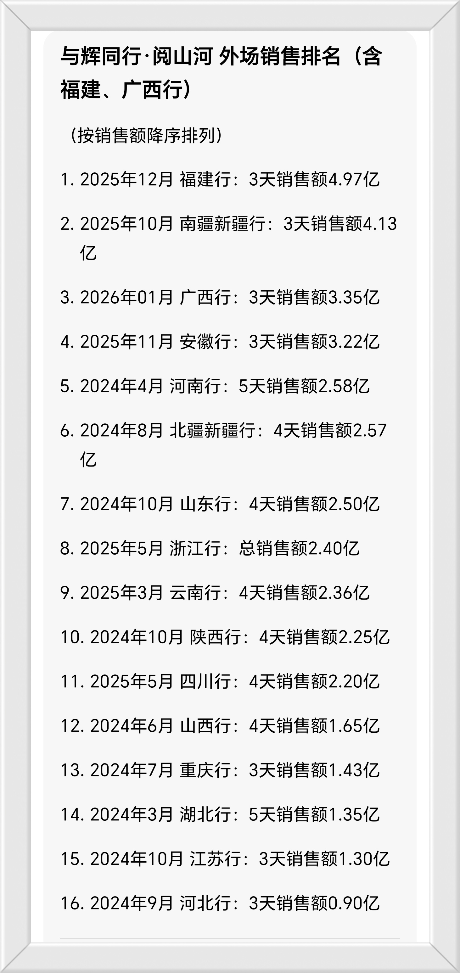 在广西行完美落幕后,宇辉带领团队小伙伴们在这次为期三天的行程战报也出来了,首先是三天的累计销售高达3.35亿,这个数字虽说对比上个月福建行的4.97亿相差不少,但却也能排入过往历次阅山河外场的第三名,可见这个三天3.35亿的销售额也是非常厉害的!