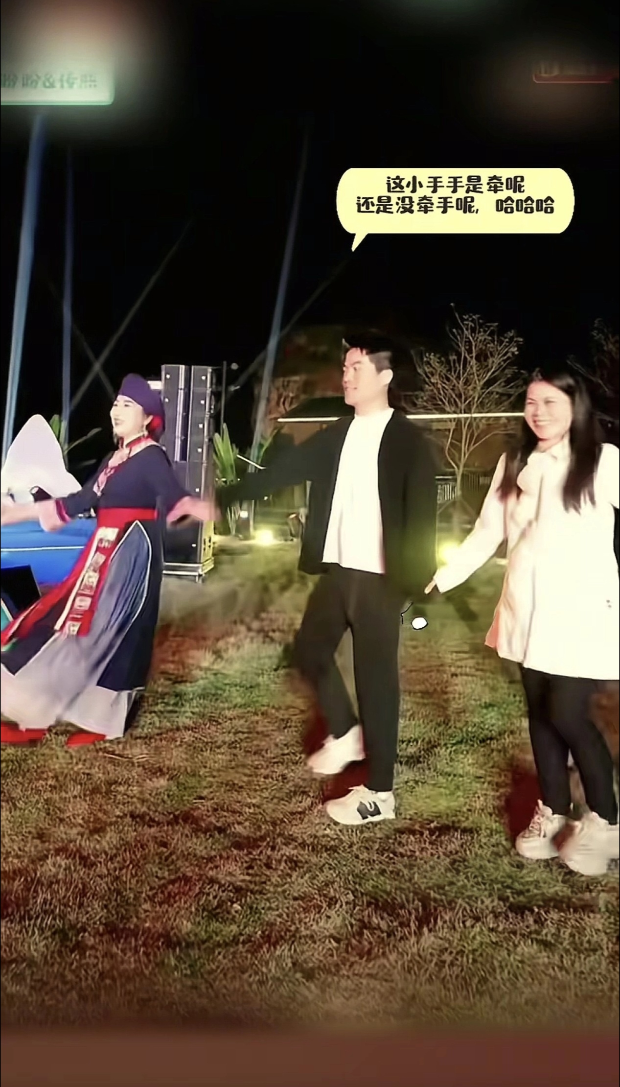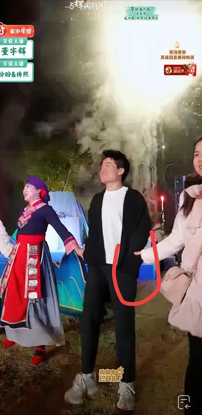 而在昨晚最后那场的精彩篝火晚会上,也发生了有趣的一幕,那就是一开始在宇辉的左右两边是各由一位女生拉着宇辉一起跳舞的,但害羞的宇辉却连手都不敢拿出来去握隔壁女生的手,搞的这个女生只好拉着宇辉的衣服袖子在跳。