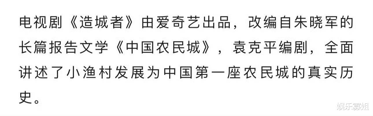 据悉,《造城者》取材于朱晓军长篇报告文学《中国农民城》,由孙皓执导,袁克平编剧,赵丽颖、黄晓明主演,以温州龙港为故事原型,讲述90年代初期随着改革开放的浪潮,一群富有激情与魄力的基层干部带领成千上万的农民兄弟,在没有政府资金支持和商业扶持的情况下,在一片滩涂上建起中国第一座“农民城”的传奇故事。