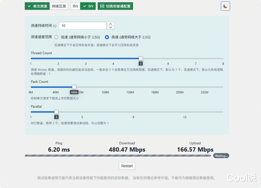 对局域网的速度进行测试,主要测试的是电脑和NAS之间的交互速度,可以看到2.5G接口模式下上传和下载分别达到了166Mbps、480Mbps。
