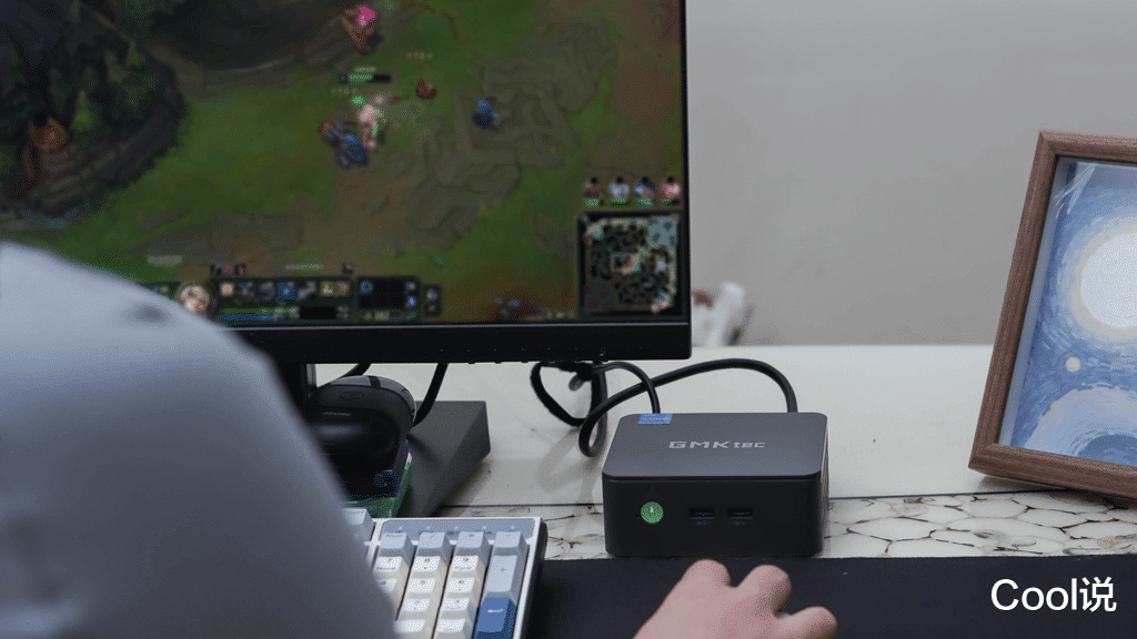 本来感觉这种主机应该玩不了游戏,随便测试了个《英雄联盟》游戏,可以看到在1080P低画质下,一局下来平均帧率为56fps,要求不高的话也能玩。