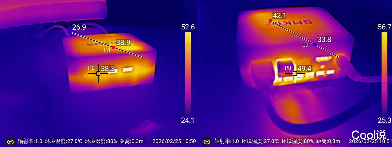 在测试跑分过程中,室温22℃对机身进行多角度的测温,出风口最高温度为49℃,机身顶部温度最高为39℃。