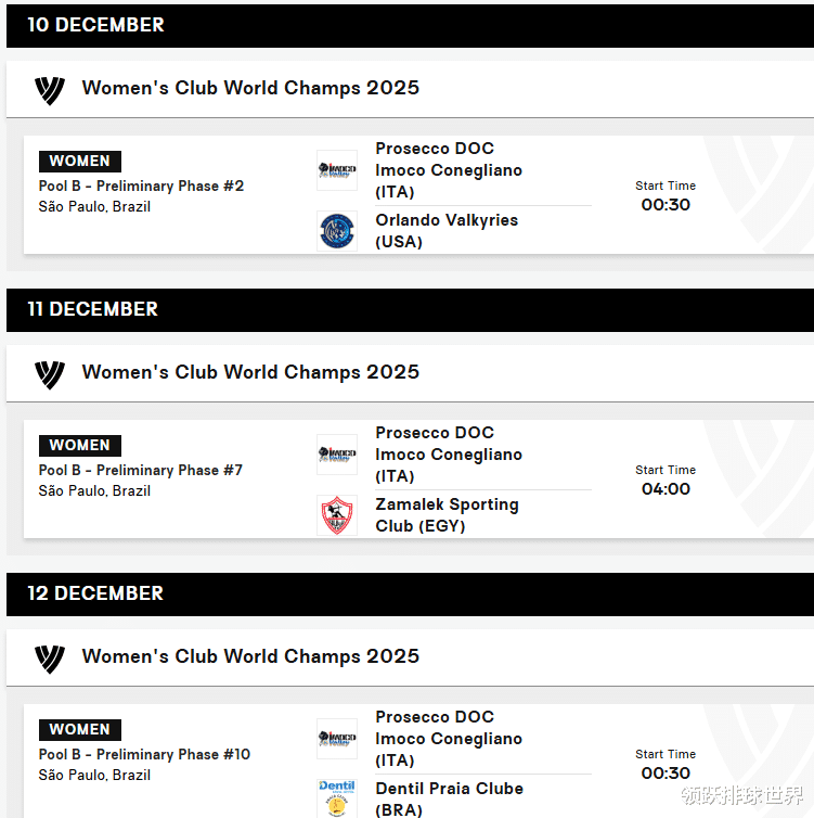 【12月11日】00:30杰特苏vs利马联盟、04:00科内利亚诺vs扎马雷克、07:30奥萨斯科vs斯坎迪奇、21:00扎马雷克vs奥兰多女武神【12月12日】00:30科内利亚诺vs乌贝兰迪亚海滩、04:00斯坎迪奇vs利马联盟、07:30奥萨斯科vs杰特苏