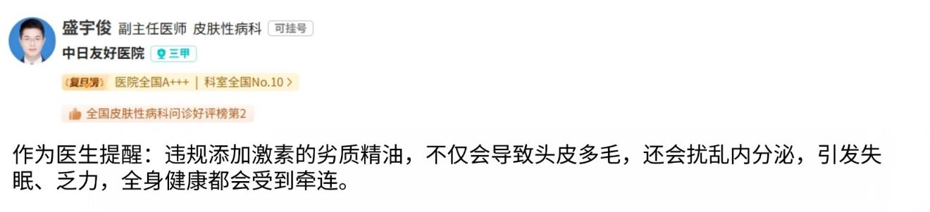 这类精油成分劣质,没有正规检测,甚至可能含激素。不仅不能减少掉发,还会刺激头皮,让发缝更宽、发际线后移,越护越糟。