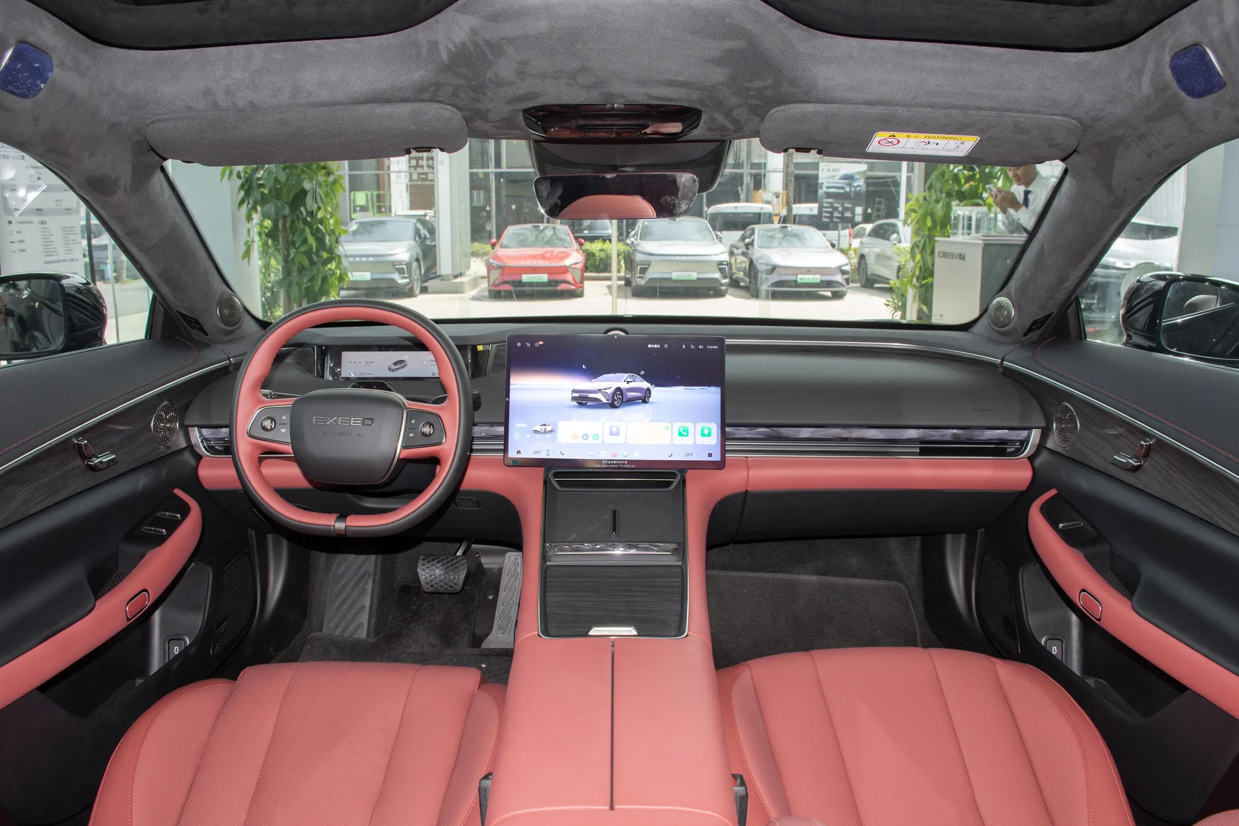 红色搭配搭配环抱式座舱,尽显豪华大气,中控布局简洁富有科技感,8.2英寸全液晶仪表盘可显示信息丰富,真皮方向盘集成加热功能和电子式怀挡,车载智能芯片用的是高通骁龙8295,15.6英寸悬浮式中控屏支持导航,蓝牙/车载电话,车联网,4G网络,OTA升级等功能,副仪表台前方设有50W手机无线充电面板。