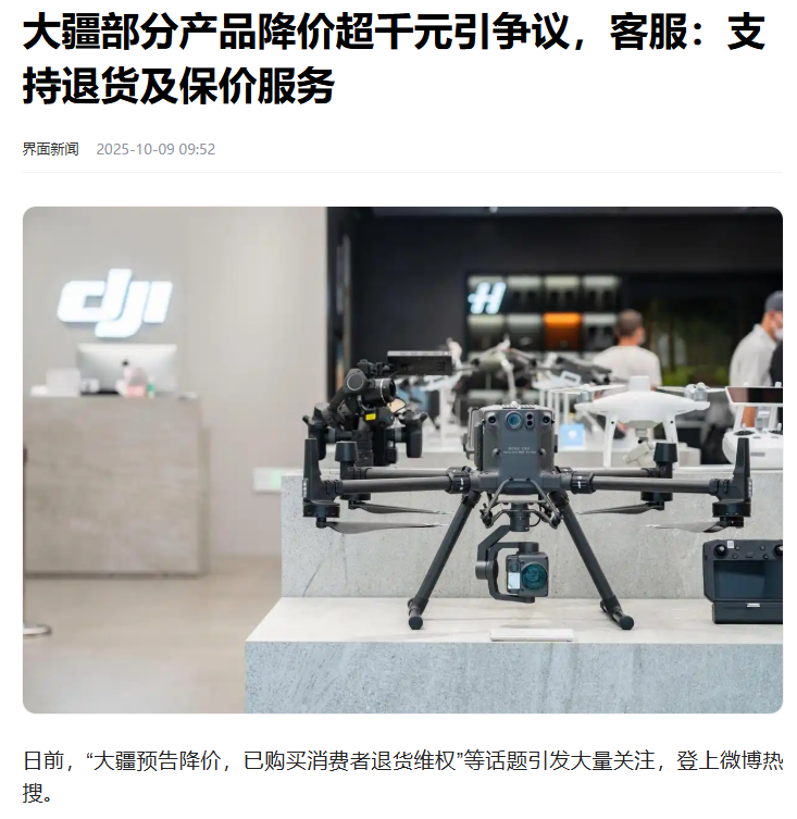 2025年10月9日消息,据界面新闻报道,大疆创新在淘宝、京东等电商平台,宣布多款产品于10月9日开始降价。针对此次降价,引发部分已经购买大疆产品的消费者“退货维权”,有多位消费者社交平台发文称,在线下购买的退款进展不顺利,线下渠道没有“价保”,部分线下门店仅支持7天内购买的产品退差价。