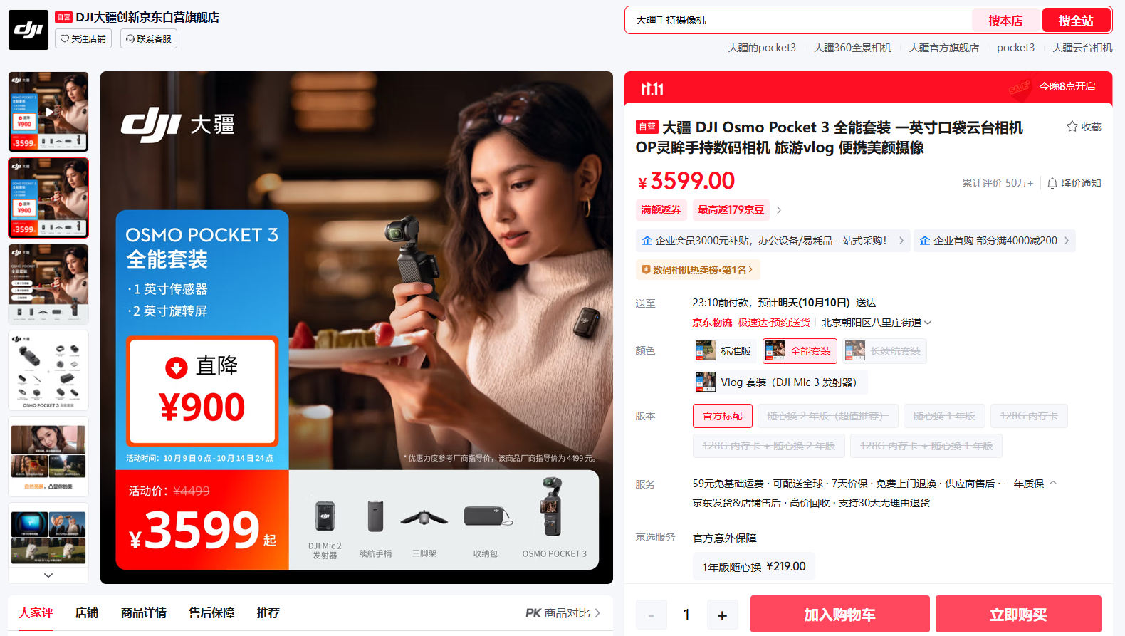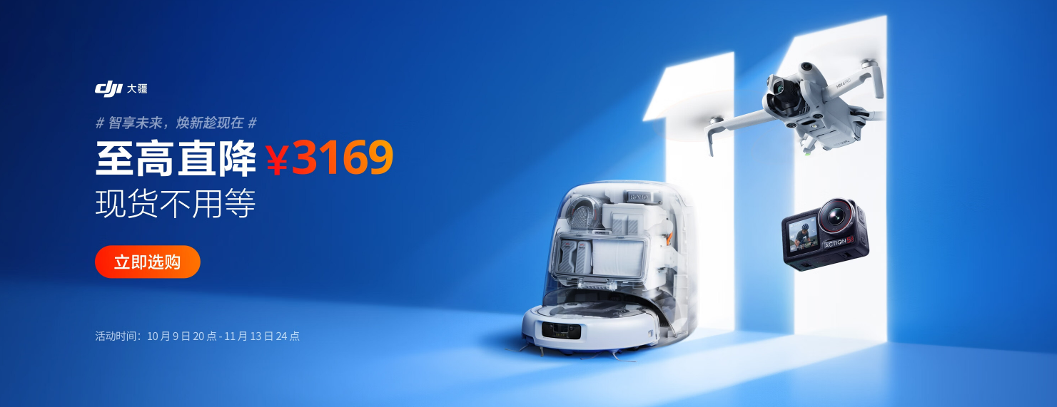 据大疆京东自营旗舰店显示,大疆双11活动从10月9日开始,优惠期限为10月9日0点-10月14日24点。其中,Osmo Pocket 3标准版直降700元,Pocket 3全能套装直降900元,Mini 3 优选迷你航拍机直降900元,Mini 4 PRO航拍无人机直降1478元,运动相机Action 4最高降价1129元等。