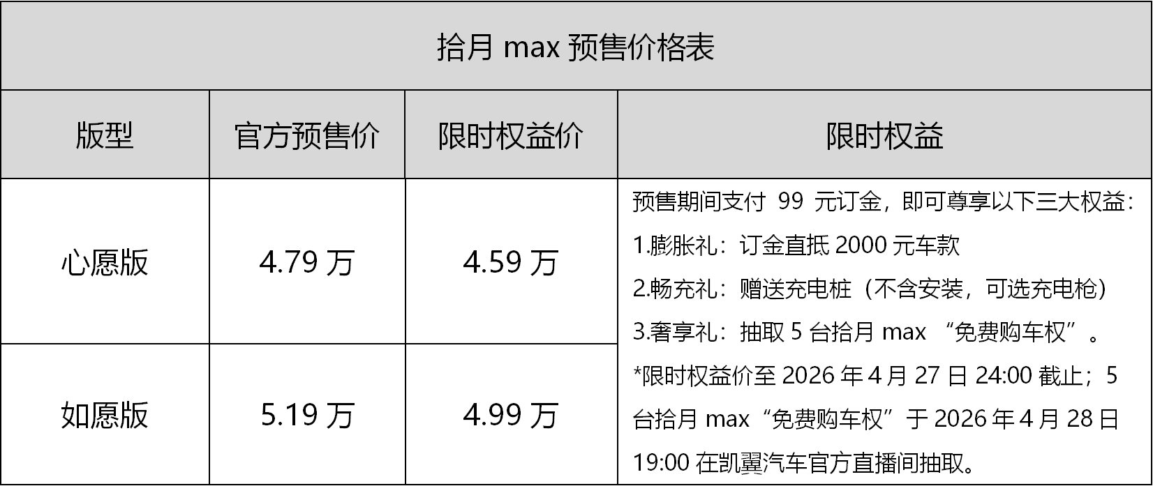 4月15日,凯翼汽车旗下全新纯电微型车拾月max正式开启预售。新车推出心愿版与如愿版两款配置,官方预售价分别为4.79万元与5.19万元,限时权益价则进一步下探至4.59万元和4.99万元。这一价格区间精准锚定当前城市短途出行刚需市场,但其更值得关注的信号在于:入门级代步车的竞争逻辑,正从“有无问题”全面转向“优劣问题”。