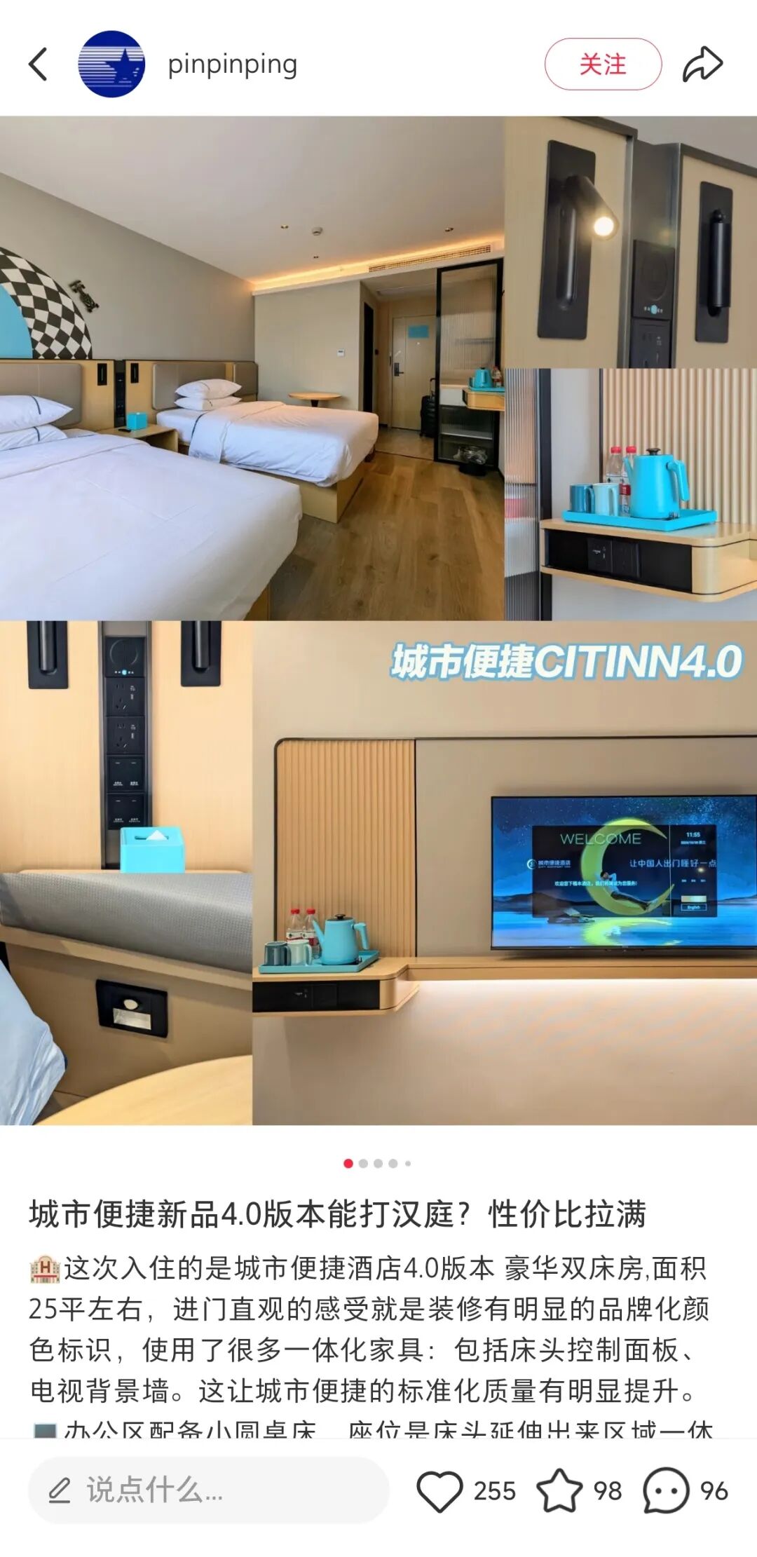 宜尚PLUS用模组化设计实现了“该省省该花花”的智慧。城市便捷更是把“精打细算”玩出了花——既要让客人体验到"再多一点"的贴心同时死死控住成本,就连小红书网友也称赞其“品牌细节无处不在,真的用心了”。