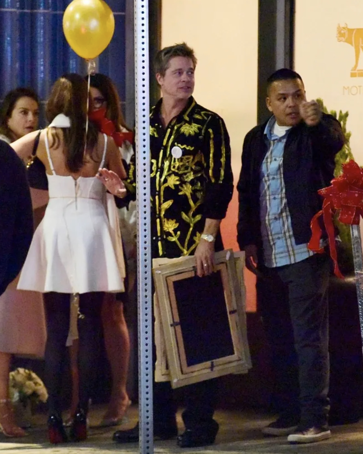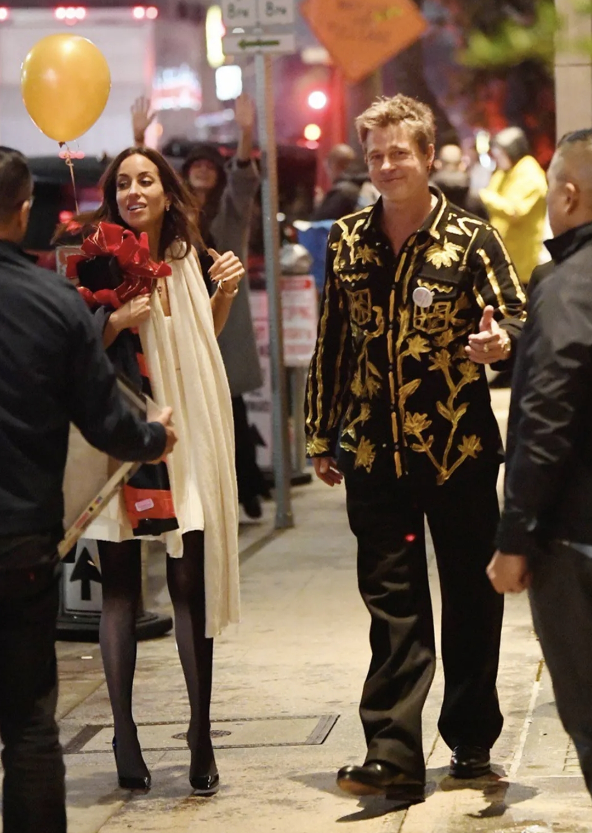 到了聚会现场,两人换了一身休闲装。60岁高龄的布拉德·皮特,身着一件黑金相间的衬衣,下身是一条黑色的休闲长裤,一头乱糟糟的发型,看来他平日里也是精心打理过,所以看上去要年轻不少。33岁的伊内斯·德拉蒙身着一袭白色露背裙,上身是一条宽大的白色披肩,下身是一双黑丝|袜,还有一头飘逸的长发。身为一名珠宝设计师,她身上没有佩戴任何首饰,只是一个简单的妆容,却给人一种知性女人的感觉。看得出来,两人的心情都很好,嘴角处都流露出了开心的笑容。