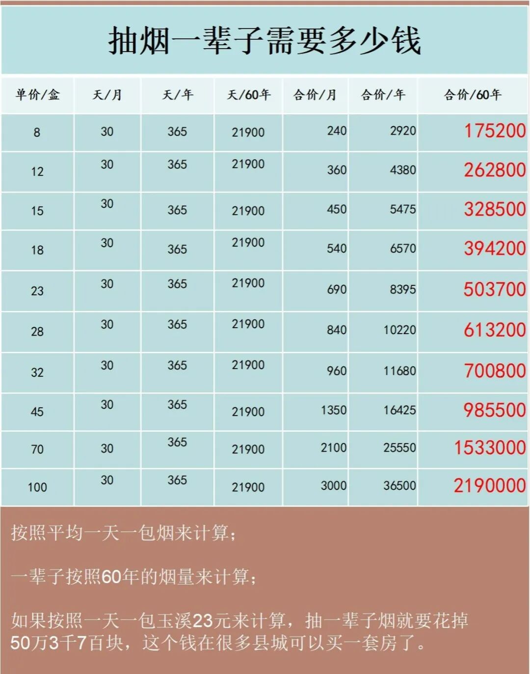计算一下:假设一天一包烟,每包30元,一年就是10950元。吸烟20年,就是219000元——足够一辆不错的汽车,或一套小公寓的首付。这还不包括潜在医疗费用、保险溢价、生产力损失。