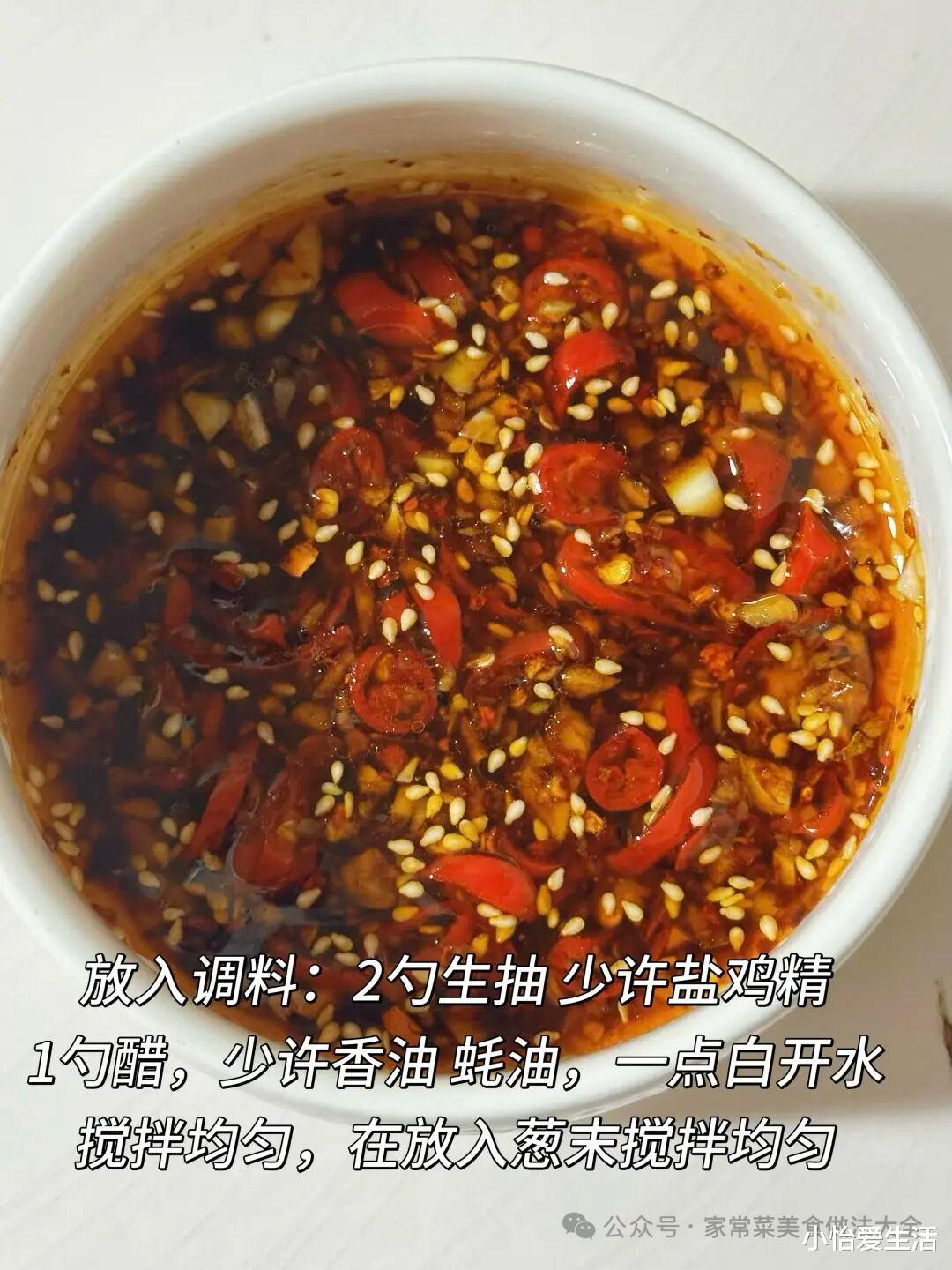 3. 调酱汁:蒜末、小米辣、生抽2勺、香醋1勺、香油1勺、糖半勺、盐少许,搅匀。
