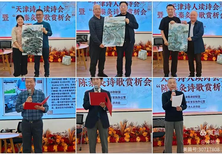 读诗嘉宾依次登台,以声音为媒介,将陈泰灸笔下山河万象、人间情愫一一唤醒。著名诗人侯宝华、刘剑作为特邀点评嘉宾,对陈泰灸的诗歌进行了极具深度的学术解读。两位嘉宾从诗歌的意象构建、语言张力、情感内核与文化价值等维度,精准剖析了其“行吟诗歌”的独特魅力,指出其作品在宏大叙事与微观抒情之间的精妙平衡,以及在全球化背景下对个体精神家园的坚守与探寻。诗与画的交融,为活动增添了别样意蕴。诗人、“天津诗人读诗会”创办人罗广才,文化学者赵文嫱,诗人胡庆军、刘萍等向陈泰灸及点评嘉宾侯宝华、刘剑,以及本期读诗会的组织者、诗人张金莲赠送了著名画家谷军的书画作品,以笔墨丹青呼应诗行间的万千气象,为这场文学盛宴增添了浓厚的艺术氛围。 诗人、《天津诗人》读本副总编辑胡庆军在总结发言中表示,“天津诗人读诗会”已走过三十一期的历程。读诗会已不仅是诗人们的定期相聚,更是一座城市对诗歌的持久守望。在快节奏的都市生活中,读诗会以其纯粹的文学追求,为喧嚣的时代保留了一片安静的精神高地,成为连接本土文脉与全国诗坛的重要桥梁。本期活动恰逢世界诗歌日,更赋予了其特殊的时代意义。诗歌,作为人类最珍贵的文化表达形式之一,在此次活动中跨越了地域与语言的界限,成为沟通心灵、传递美好的共同语言。 活动在热烈的掌声中圆满落幕。诗人们表示,这场发生在津塔之上的诗歌盛会,不仅是对陈泰灸行吟精神的致敬,更是对“诗与远方”永恒主题的再次确认。愿诗歌的力量,如春风化雨,浸润人心,让诗意在这座城市中生生不息。