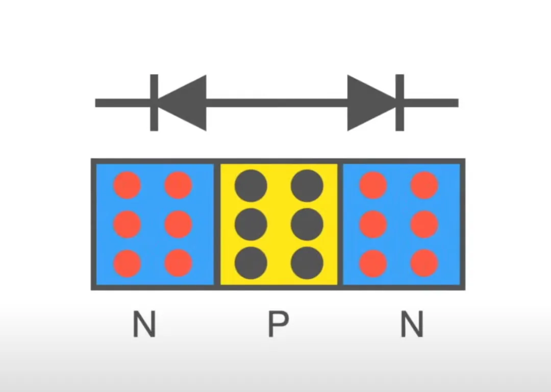 单独链接左右两个N端(一边作发射区,一边做集电区),由于中间是P端(做基区),怎么都形不成电流。这时候,如果吧左边的N端和P端接通,给一个小电流,N端发射区的电子涌入中间很薄的电子穴有限的P端基区,小部分电子留回N端,大部分电子被激活穿透了很薄的P端涌入右边的N端集电区,这时候,左右两个N端打通了,而且电流更大,这就等于一个放大器。当然,也可以做开关器。流动示意图如下: