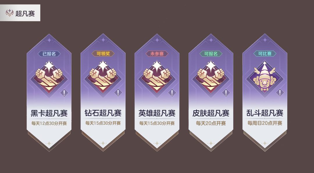积分赛分为“超凡赛”和“争霸赛”2类;超凡赛有“黑卡超凡赛”、“英雄超凡赛”、“皮肤超凡赛”、“钻石超凡赛”、“乱斗超凡赛”等5种超凡赛,而争霸赛则分为“黑卡争霸赛”和“话费争霸赛”2种。