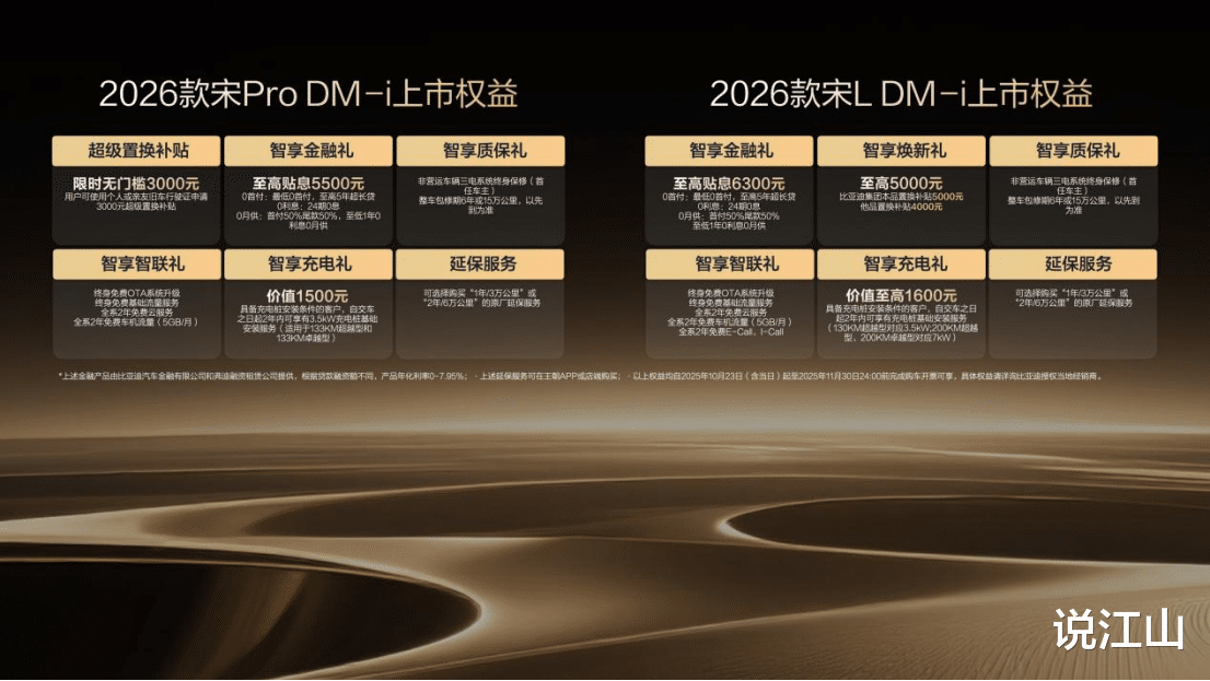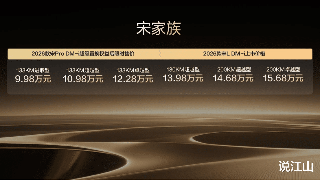10月23日,比亚迪宋家族的两款主力车型——2026款宋L DM-i 和 2026款宋Pro DM-i 一起上市了。简单概括就是,加量,还变相降价了。2026款宋L DM-i:官方指导价 13.98 - 15.68万元;2026款宋Pro DM-i:有个“超级置换权益”,在11月30日前下单,限时售价 9.98 - 12.28万元起,这个价格,尤其是宋Pro DM-i,把主流插混SUV的门槛拉到了10万以内,压力直接给到了同级别的燃油车。