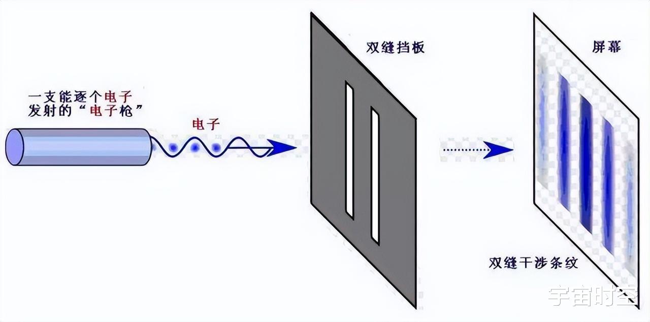 实验道具和过程都不复杂。一个电子发射器,一块拥有两条狭缝的挡板,还有一个接收屏幕。只需要朝向挡板不断发射电子,然后观察屏幕出现的条纹就可以了。