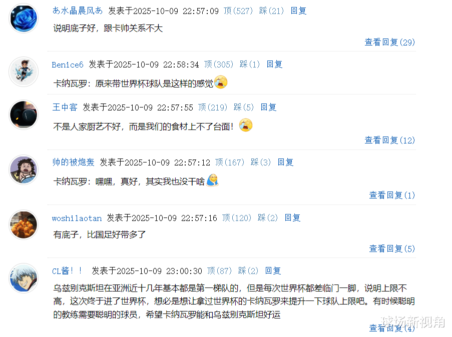 从这些球迷的话中可以看出,他们并不认为乌兹别克斯坦队2-0战胜科威特是卡纳瓦罗的功劳,毕竟他才带队三天,甚至可以说,卡纳瓦罗现在知道每一位乌兹别克斯坦队球员都是一个未知,所以卡纳瓦罗想要坐稳帅位,接下来还需要拿出过硬的成绩……