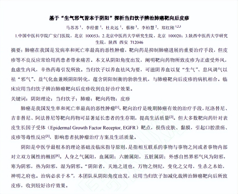 参考资料[1] 马苏苏,基于“生气邪气皆本于阴阳”探析当归饮子辨治肺癌靶向后皮疹[J/OL].中医学报,[2024-09-13].