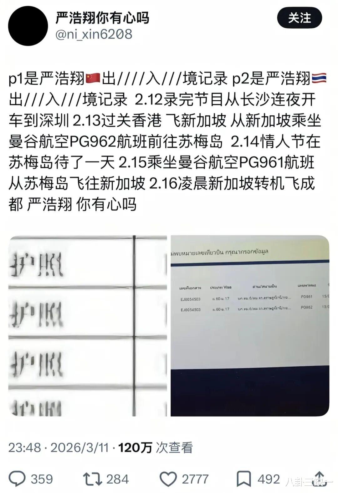 严浩翔本人更是一切如常,隔天现身海口录制《奔跑吧》,简约白T搭配黑色长裤,顺毛发型凸显少年感,生图下五官立体、皮肤白皙。不仅全程笑容明媚,以标志性“八字眉”表情向粉丝比心、打招呼,回应“哈喽小猫”口号;录制间隙还与张真源打闹,因对方站错位置调皮“制裁”。