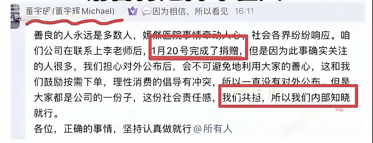 还真是“一波未平一波又起”,可见这些键盘黑子们有多想把董宇辉的声誉给抹黑掉,但像宇辉这种好人大家是不会让他们得逞的!于是很快又有知情网友晒出了一条董宇辉在公司内部群里对给嫣然基金捐款的回应,从这条回应中,大家可以知道,在嫣然唇腭裂医院事件曝出后,宇辉就第一时间安排公司团队去联系李亚鹏老师,并且在1月20日就已经完成了捐款。