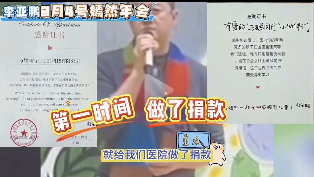而直接有力击碎这些抹黑言论的一幕,则发生在2月4日晚,当晚李亚鹏在嫣然唇腭裂医院的年会发言中,特意对与辉同行的董宇辉提出了感谢,并且透露宇辉他们是事情发生后的第一时间就联系他们进行了捐款,并且表示宇辉他们捐款后都不愿去公开,但他本人还是要对这些慷慨解囊的捐赠表示感谢。