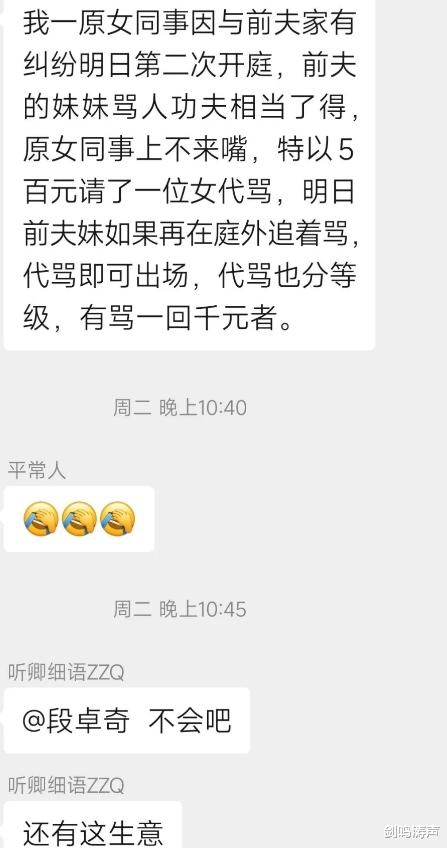 另一则是说代骂者的:发布消息者有一原女同事,因与前夫家有纠纷,第二天就要第二次开庭了。前夫的妹妹骂人功夫相当了得,而原女同事嘴却上不来,骂人功夫欠佳,特以500元的价格请了一位女代骂,明日前夫妹如果再在庭外追着骂,代骂即可出场代而骂之。代骂也分等级,有骂一回可得千元者。